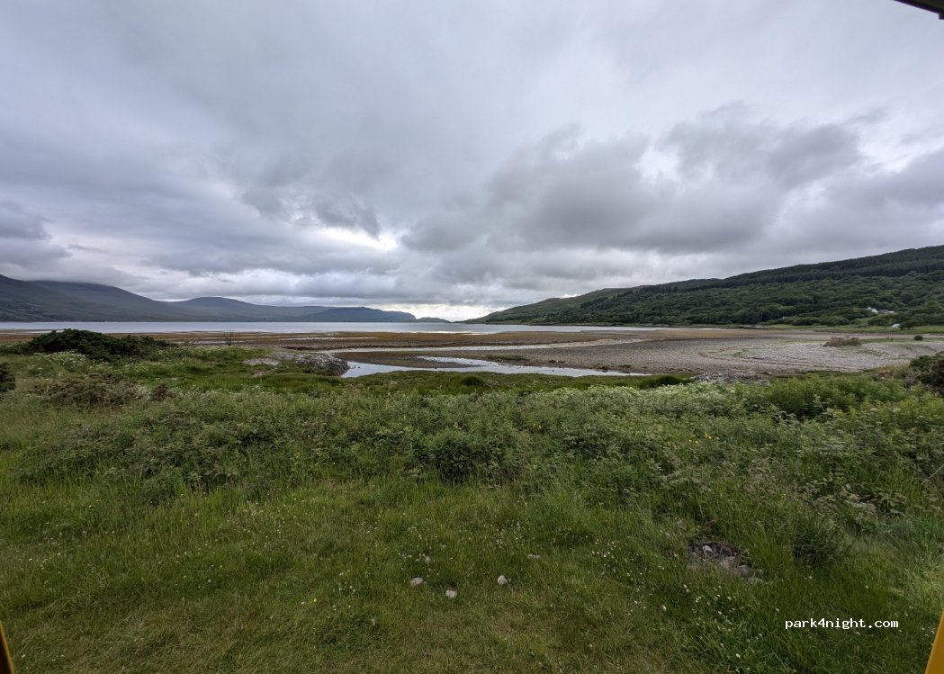 brilliant views, sighting of ospreys & white tail eagles within 3 hours. on shore front. Choice of open (right) or enclosed/ secluded spots (left). Owner/farmer collects money once a day. white arrows out of campsite to right, goes to the (freshly painted) toilets and washing up sink just down the lane. A torch needed for walk. If you miss the farmer can pay at the house and also sells venison.