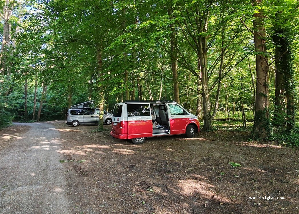 Stayed one night with 3 other cars but there was space for more - no blank sun, direct woods around, calm and safe - 20min from the autoroute and it will be my go to spot for crossing Paris.