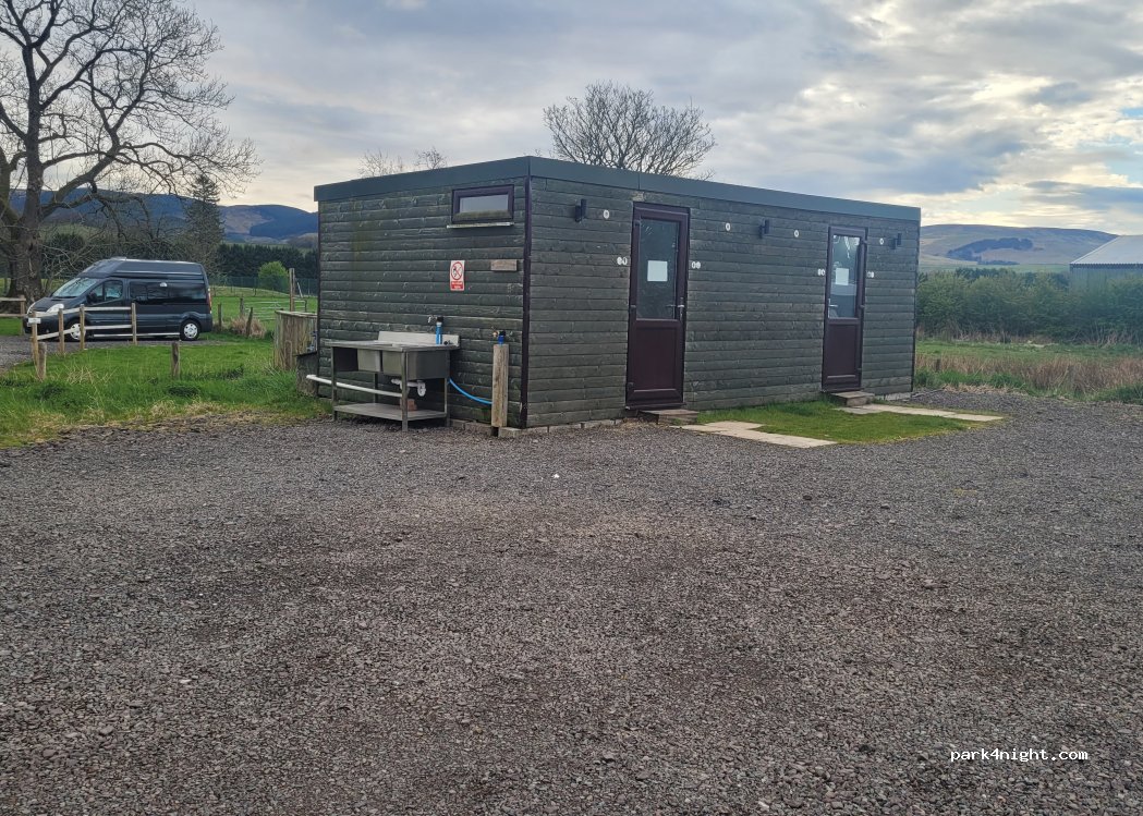 Not fancy but for £9 without electric it is good value Toilets & Shower block closed From Nov till ? Toilet in Coffee shop 10am till 4pm in winter waste disposal & Drinking water available Not far from amenities in Moffat I drove 10min drive to Allandale services & used free shower leave your vehicle key at W H Smith & get key to shower (2) available Excellent. All in all a good cheap spot.