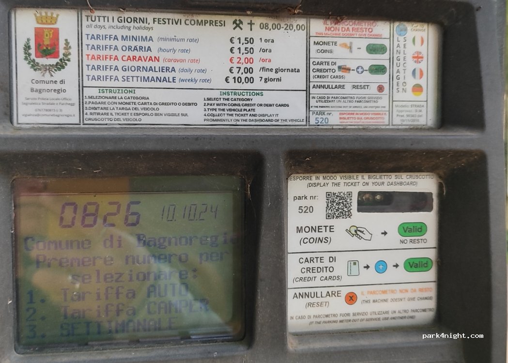 Il parcheggio e' ombreggiato e il costo e' di 5 € per 24 ore vicino al centro ottimo per visitare Bagnoregio no servizi