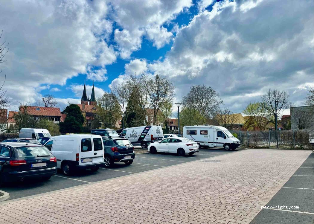 Wie bei sehr vielen öffentlichen Parkplätzen kann es am Freitagabend unruhig werden. Jugendliche ziehen durch die Gassen, so auch hier. Aus unserer Erfahrung wissen wir inzwischen, dass es meist nur den Freitag betrifft. Hier haben jugendliche Männer Sachbeschädigungen an parkenden Autos vorgenommen, wir haben die Polizei gerufen, die sehr schnell kam und danach war Ruhe. Die Zufahrtsstreifen zu den Parkplätzen sind eng, aber für einen Kastenwagen mit 6,35 m Länge durchaus machbar. Das Stadtzentrum liegt in nur 300 m Entfernung. Der Parkplatz ist ohne jede Beschränkung kostenlos, aber ohne Service.