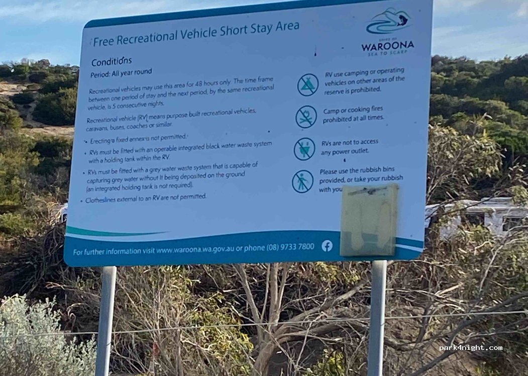 Parking autorisé 1 nuit pour les camping-car autonome. La plage est accessible au 4×4 et on est entouré de véhicules qui gonflent ou dégonflent leurs pneus. Toutes les commodités : eau, douches, BBQ, tables, abris, jeux enfants, toilettes, et gazon... L'accès de la plage est à 50 m. Spot de pêche. Le soir on profite de la visite des kangourous.