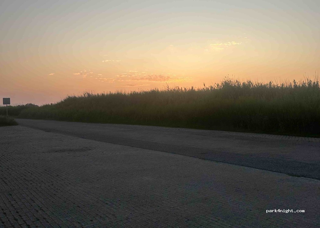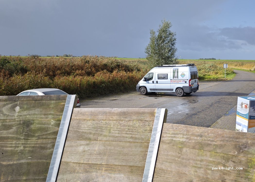 Parkeerplaats voor ca 6 auto’s aan het einde een doodlopende weg. Mooi uitkijkpunt met bankjes. Gedurende de avond komen er vogelspotters langs maar iedereen zegt vriendelijk gedag. Als het donker wordt staan we alleen en brengen we een rustige nacht door.
