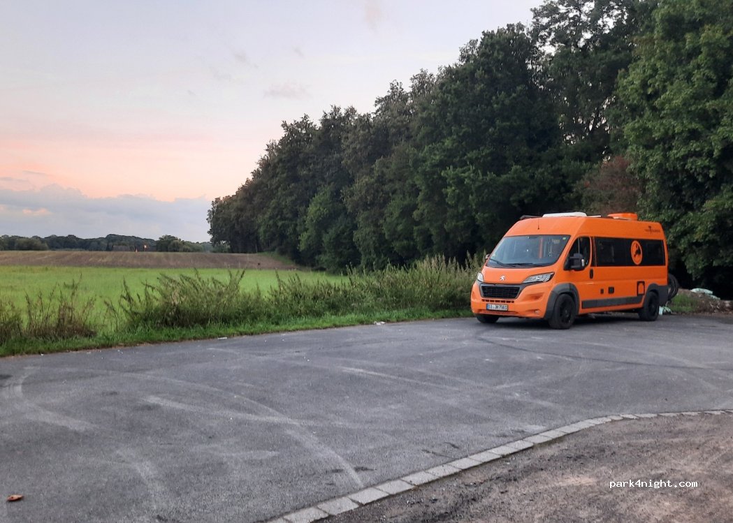 Lieu très calme, en effet, on entend légèrement le bruit de la route au loin mais ce n’est pas gênant. Malheureusement le long du bois est devenu des toilettes à ciel ouvert mais en ne se garant pas au près on peut passer outre ! Le matin, vers 9h30 quelques promeneurs sont passés sans occasionner de gêne.