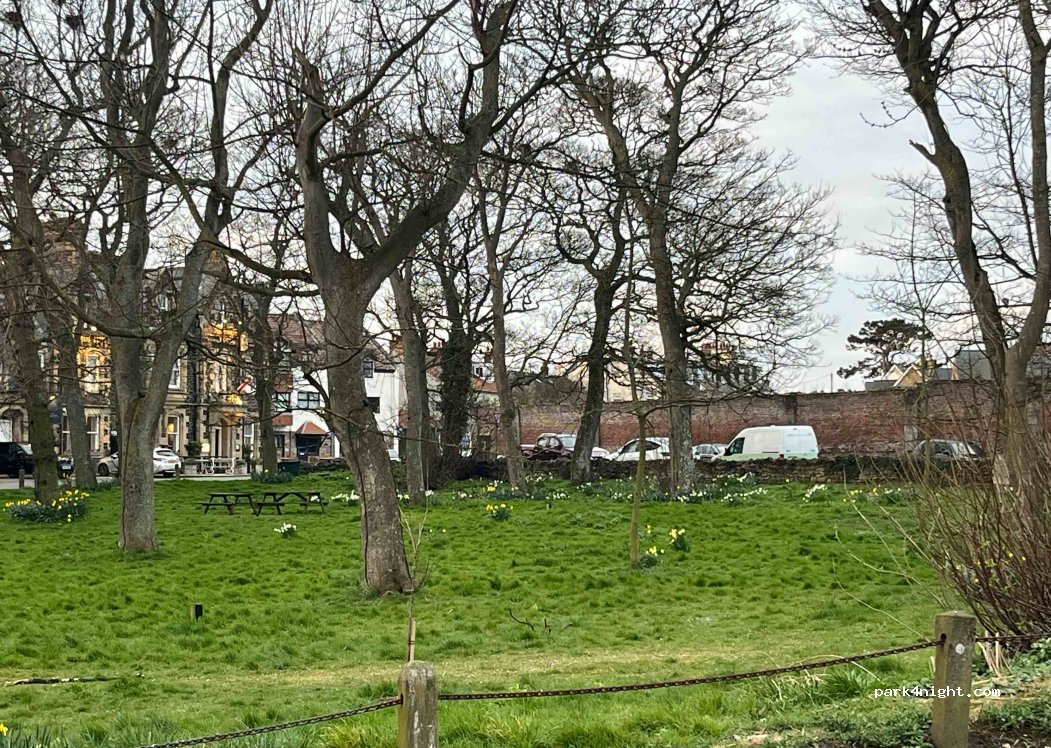 Quiet night after a pub meal. Clean toilets opposite the grass square were open all night.