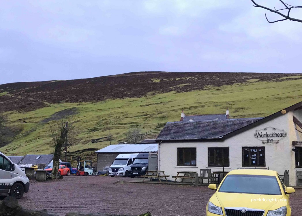 Wanlockhead Inn, highest pub in Scotland and Glamping pods. Please visit their website. They also allow camper-vans and motor homes to stop provided you go in for a drink and a friendly chat.