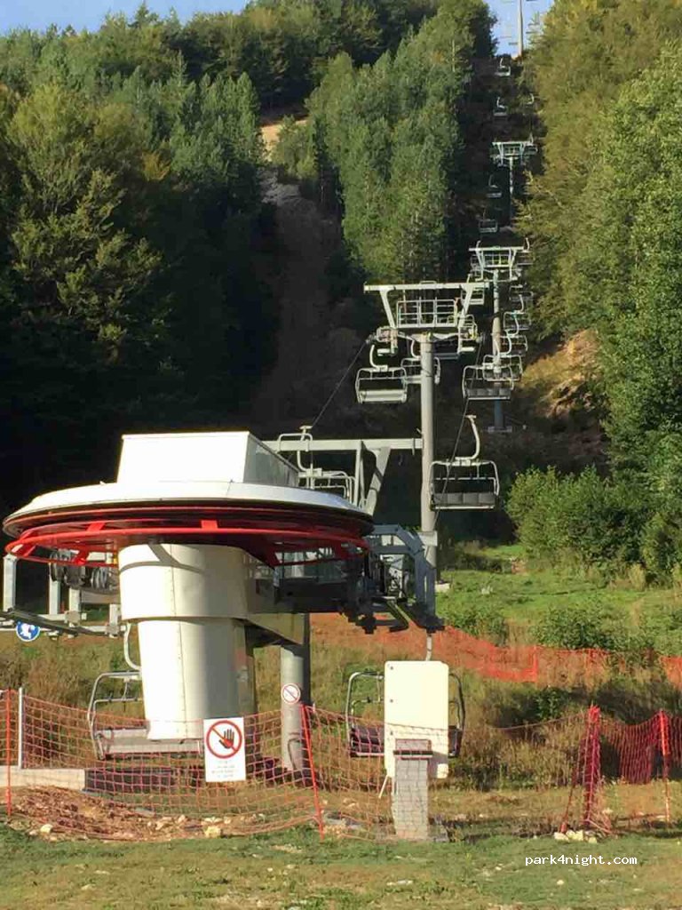 Parkplatz des Skigebiets Lorica. Ruhige Nacht. Ermöglicht es Ihnen, mit der Seilbahn im Schnee nach oben zu klettern. TOILETTE. Wildwasser. Freundlicher Empfang an der Bar Rosticeria