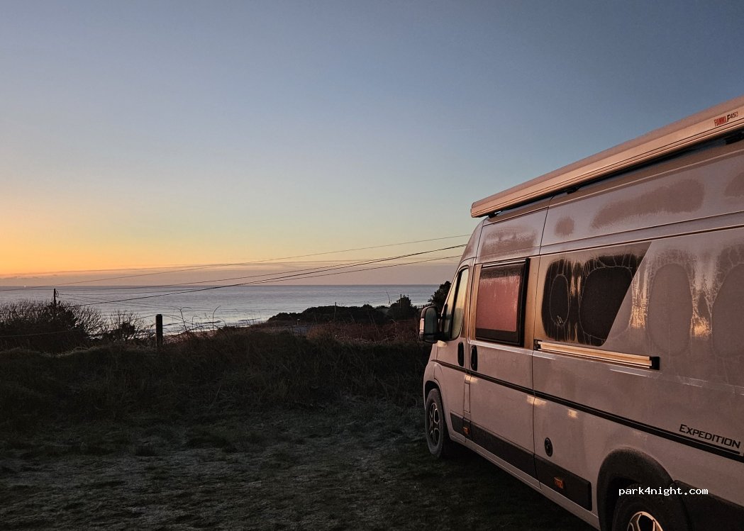 Beautiful, quiet location overlooking the beach. People visit the beach during the day, but it's less busy than many others on the Wexford coast. There were about seven other vans there the night we stayed. The lovely clifftop walk to Cahore Pier takes about 15 minutes. I'll be back. Height restriction of 2m!!