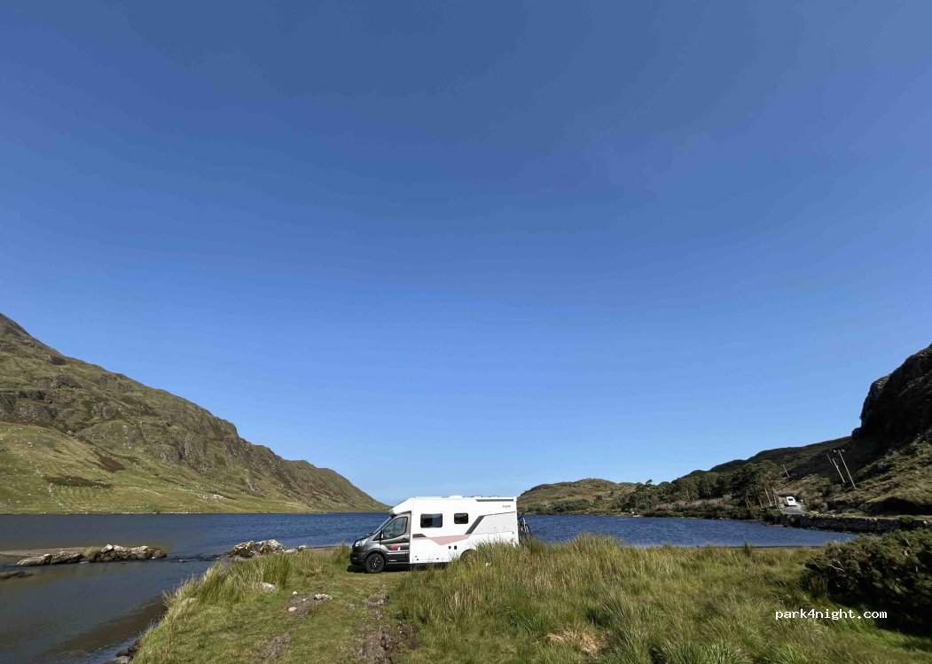 Wunderschöner Platz an einem großen See neben einer Straße. Es fahren sehr wenige Autos vorbei. Ich vermute, dass so lange kein Müll hinterlassen wird das parken geduldet wird. Überall sind Schafe, daher gehe ich mal davon aus dass es einen Besitzer des Grundstückes gibt.