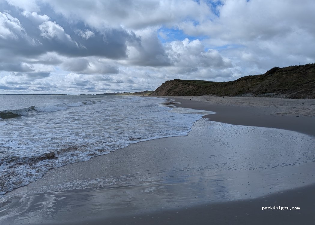 Stayed here Monday June 03rd. Lovely walk along the beach. Beautiful when the sun shines but weather was quite poor when we were there. 3 other vans here. Locals use this beach a lot so people come and go often.