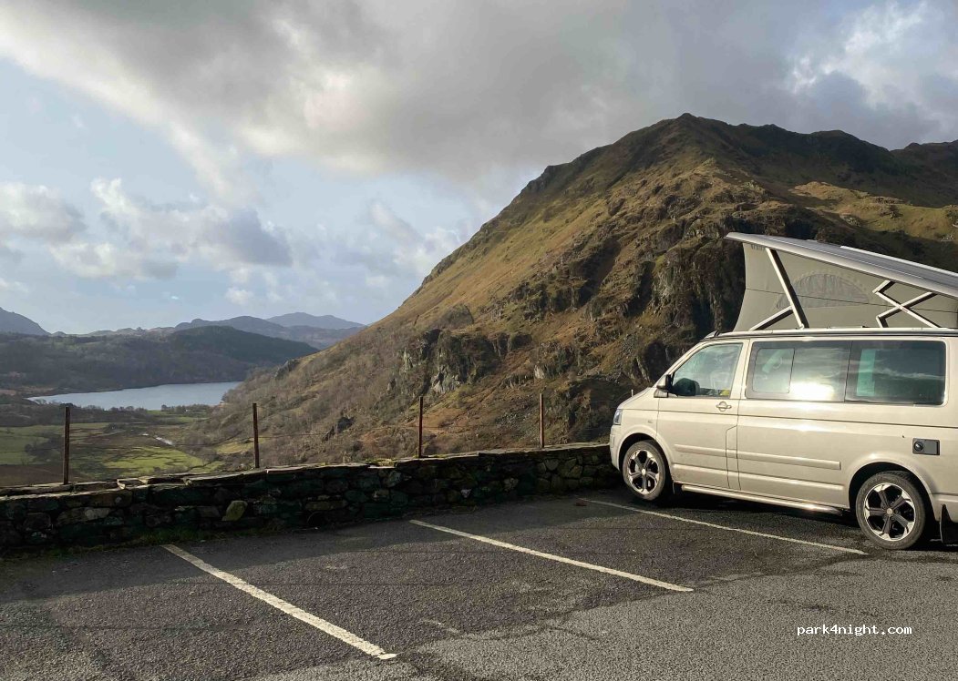 Loved this parking spot. Views of Snowdon and valley second to none. There are no signs saying no overnight parking. Space for around 20 vehicles. Windy due to exposure but really lovely. No other vans there when we were there. Out of courtesy I’d want to be out of there by 8am ish to let people park during the day but no problem being there overnight. Would recommend!!