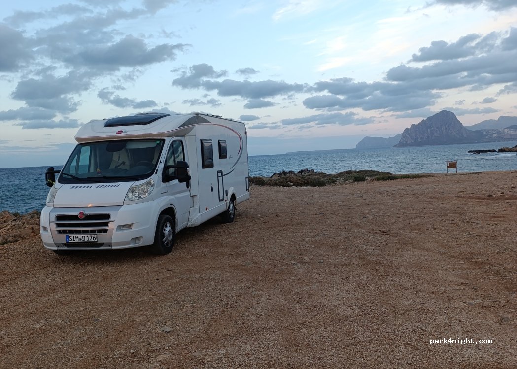 Absolute Top Aussicht. Die angrenzende Hauptstraße hört man kaum bis gar nicht, wenn man direkt vorne am Meer steht. Das Gelände ist sehr uneben, aber auch mit einem großen Wohnmobil zu schaffen. Leider vermüllt, wie überall auf Sizilien. Die Übernachtung wird geduldet. Ein Einheimischer brachte gerade noch 2 Wohnmobile hierhin.