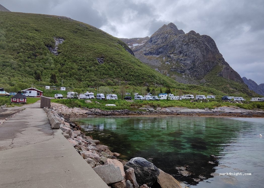 Wir haben hier nicht übernachtet. Da es hier auf den Lofoten wenig Möglichkeiten gibt zum Ver-und Entsorgen sind wir hetgefahren. Für 10 Euro /100 nok kann man Ver-und Entsorgen, mit Bodenablass (eher selten in Norwegen). Sehr netter Empfang an der Rezeption.