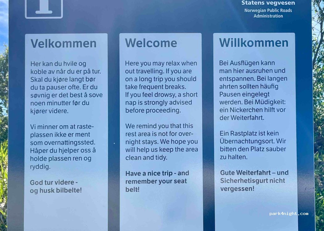 Perfecto. Con servicio de negras, baños, mesas para comer y el inicio de ruta de subida al pico JUSTADTINDEN. Gratis. Algo de ruido de la carretera pero no molesto.