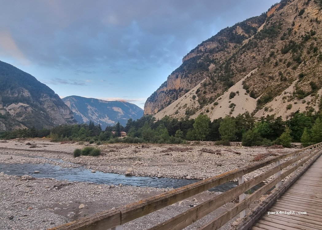 Max 3,5T et 2,10m large. Petit parking de l’autre côté du pont, plus éloigné de la route. Très belles vues sur les montagnes