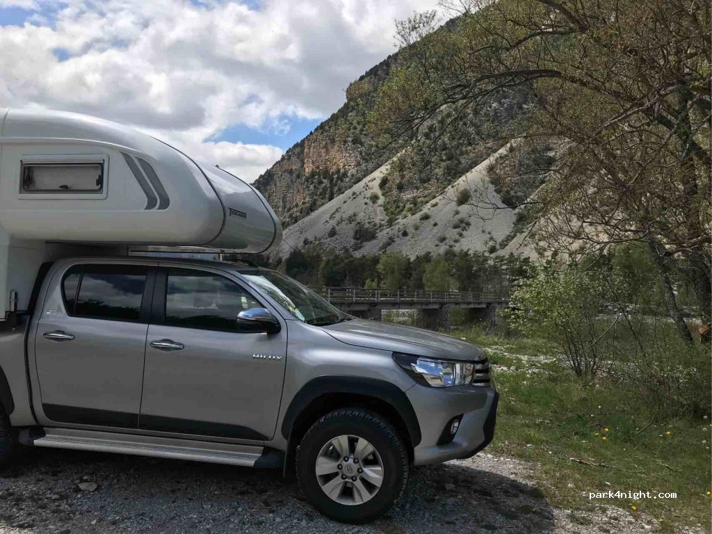 Max 3,5T and 2,10m wide. Small parking on the other side of the bridge, farther from the road. Beautiful views of the mountains