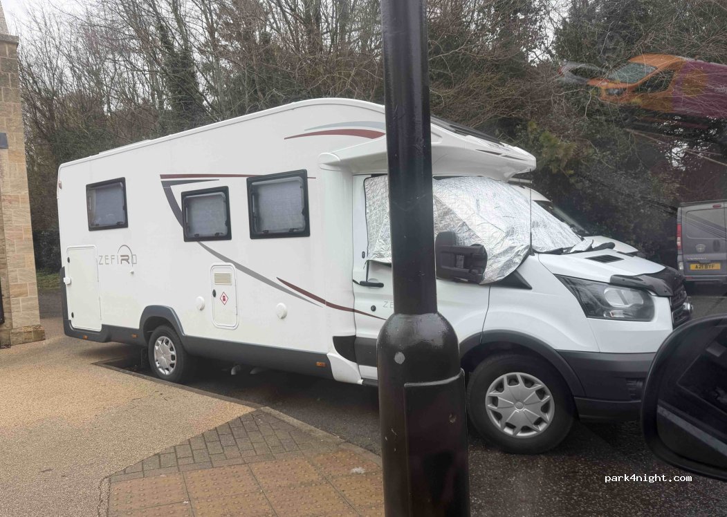 We stayed here for one night and arrived just after 5pm. There were not many cars in the car park at that time. We parked near to the Tesco entrance as we are 6.3 m long and needed to over hang the grass, reversed up against the wall, as the other sections of the car park did not give the space needed. Spaces are not big, but we got all four wheels into the bay. Quiet night sleep.