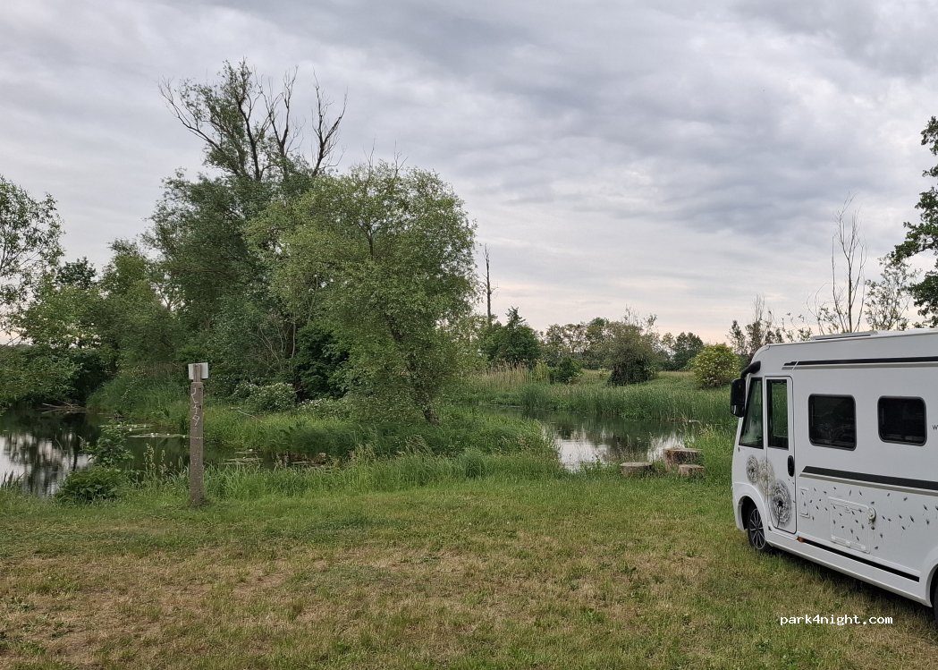 In the quiet and green car park of the canoe station, directly on the old Oder. Very friendly staff. Electricity, toilet and showers are clean and tidy.