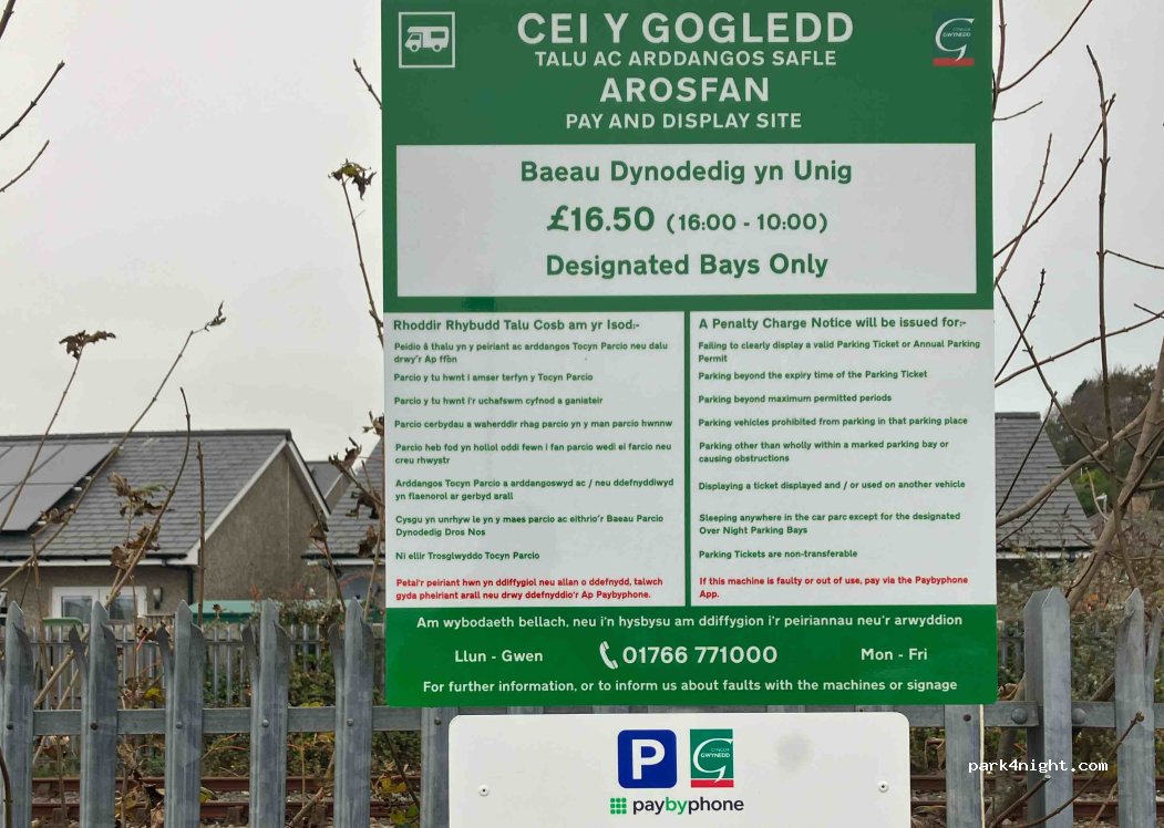 Great little stopover. a few minutes walk away from the centre of Pwllheli. No restrictions visible. overlooking the harbour. Some traffic but nothing too intrusive.