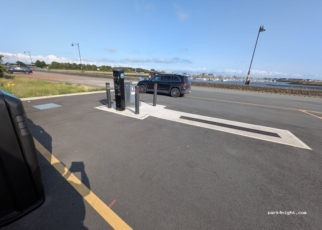 Arrived early afternoon after finding Criccieth aire closed. Spent a few hours on the great beach just round the corner. There were 2 coaches parked up in 2 of the bays when we arrived. One left before 4.00pm the other a bit later. There is a railway line directly behind, but this wasn't an issue for us. Pleasant outlook over the water and marina/quay.