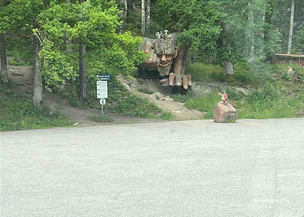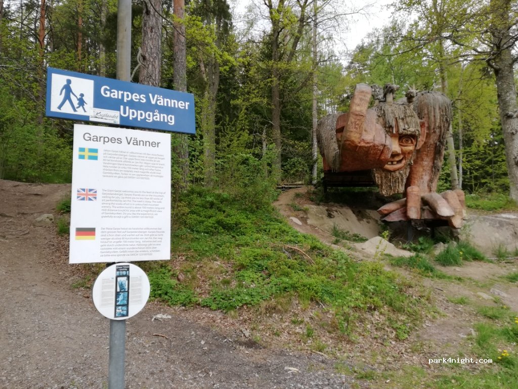 Trollparken Garpes Vänner: Sehr großer, öffentlicher Parkplatz am Ortsrand von Gamleby direkt an der Straße. Wir haben direkt an der Straße geparkt und kaum etwas gehört. Service (Toiletten, Müllentsorgung etc) gibt es nicht. Vom Parkplatz aus kann man eine kleine Wanderung durch den Trollpark machen (steiler Anstieg) und dabei die (nicht unbedingt spektakuläre) Aussicht auf die Umgebung genießen.
