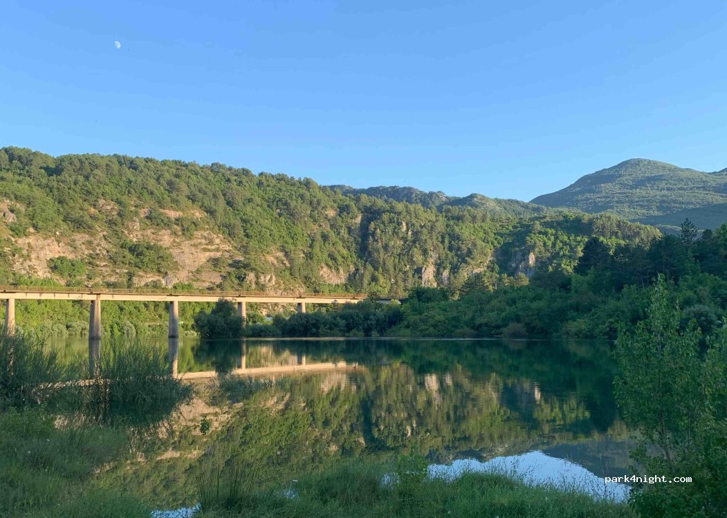From the direction of Trebinje, there is a gravel path, on the left just before the tunnel. After about 50m, it opens into a picnic sight with a table and benches by the river. We were alone and found a level spot quite easily. We watched kingfishers in peaceful, scenic surroundings. Dam water is released upstream during the day and night so the sound of water is always possible. Remove rubbish.