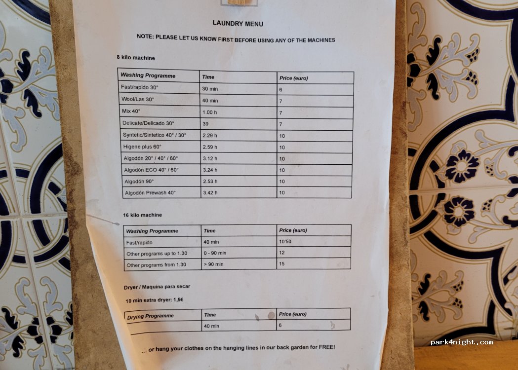 Wir waren zweimal zum waschen da. Eine Maschine kostet ca. 6 Euro und der Trockner 5 Euro, finden wir ein wenig teuer aber passt. Das vegane Essen sowie der Kaffee war sehr gut. Die Herren Toiletten sind nicht mehr gut in Schuss. Alles in allem zu empfehlen :)