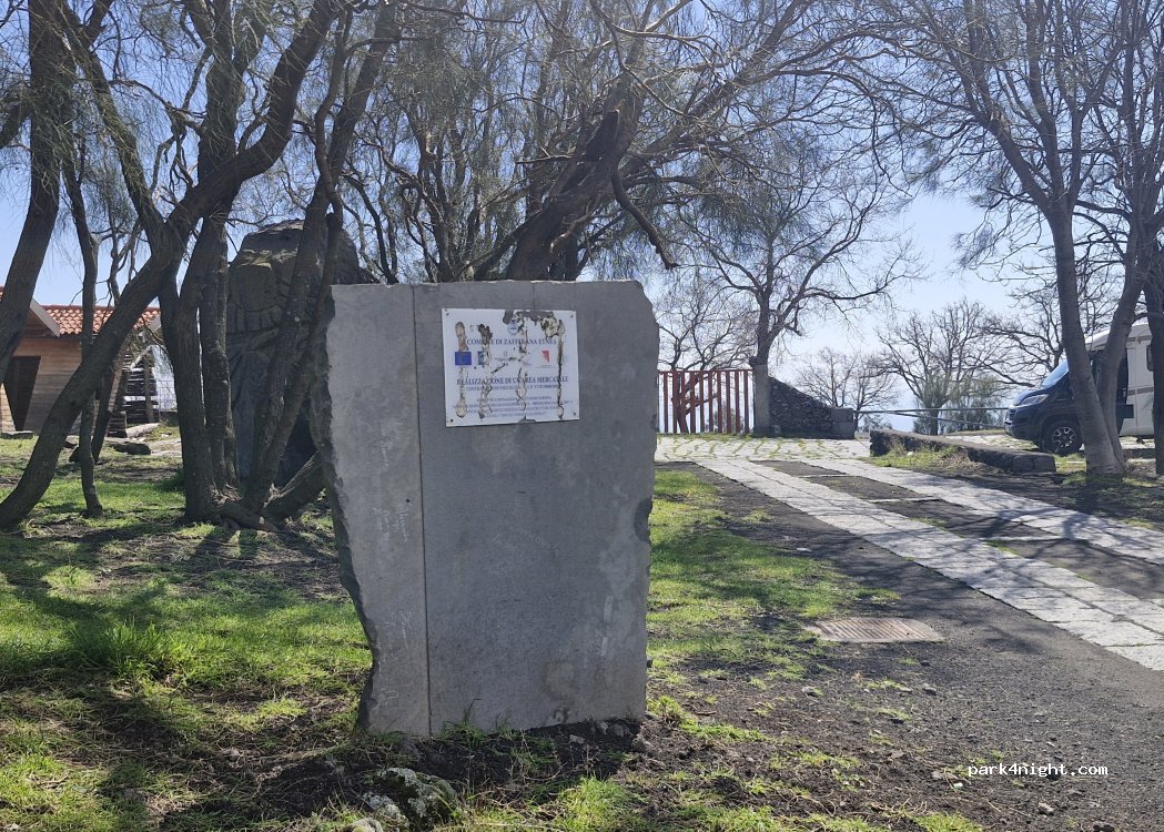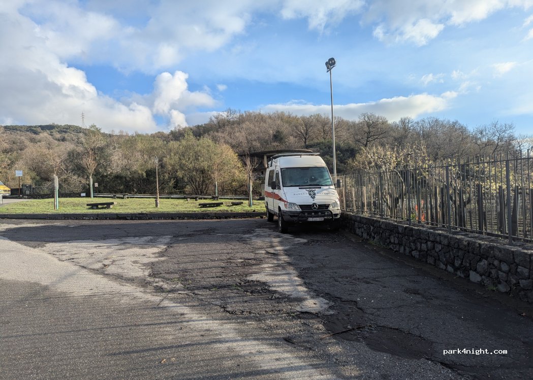 50 m en dessous du point indiqué, accès dans un petit parc désaffecté à proximité du point d eau indiqué, plus agréable que le parking. Nous y sommes restés 2 nuits. Vue sur la côte et sur la pointe de l Etna. Grand calme et c est plat.