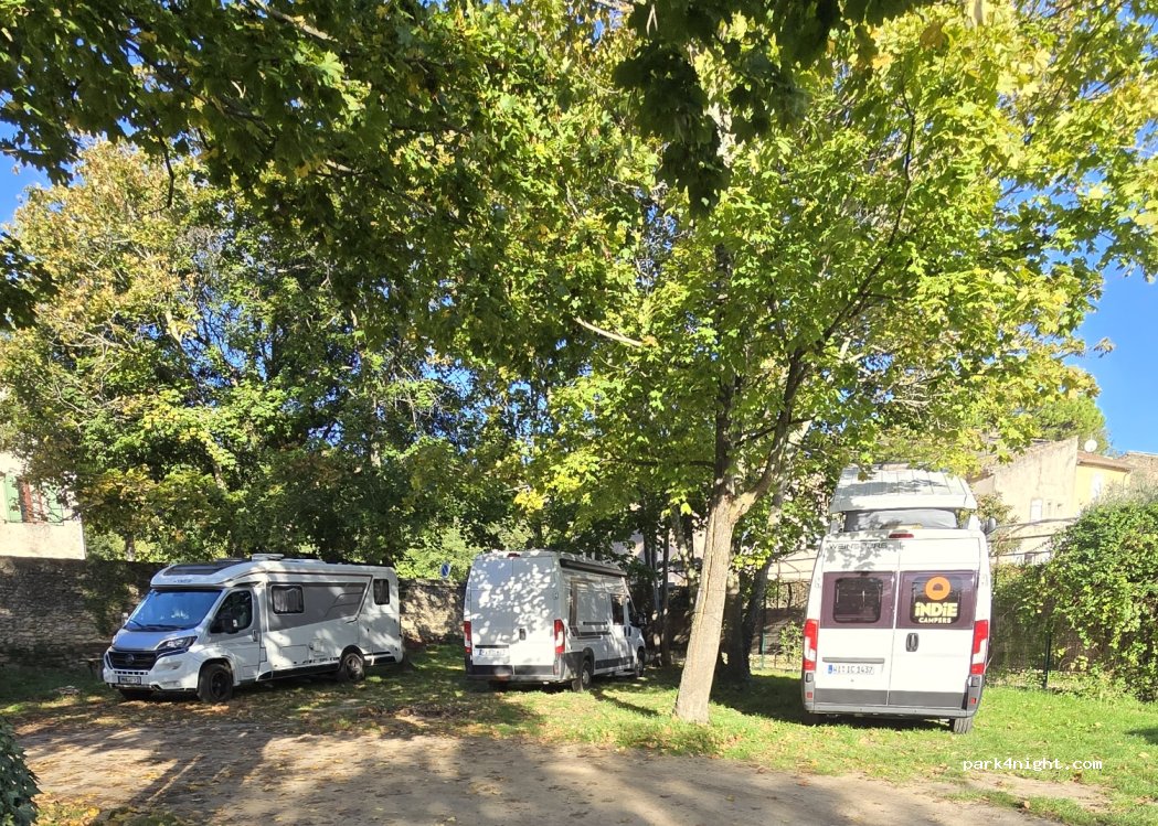 Nous y avons passé une excellente nuit. Jolie petite aire avec des arbres,nous sommes dans un p’tit parc. C’est très calme et agréable. Boulangerie dans le village à 5 minutes à pieds. Super endroit merci Rochegude.