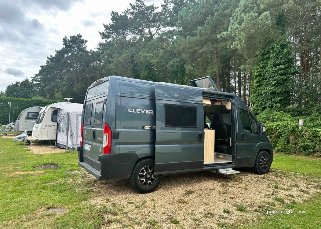 Adequate facilities, fairly costly (£31.50 per night). The B road (literally on the other side of the fence) is very close and fairly busy. The host is very friendly and helpful. 50p charge to use the shower and there is a small fee for dogs, which the host waived for us on this occasion. Certainly worth calling in if other sites locally are fully booked.
