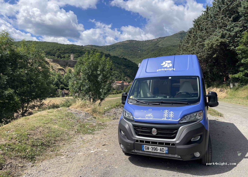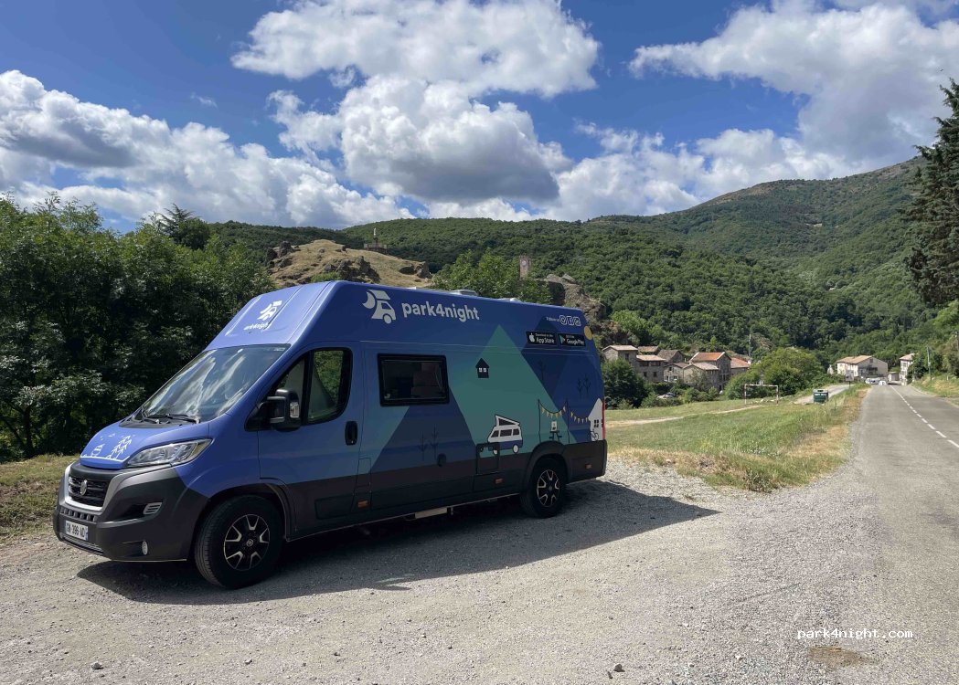 Place de parking le long d'une route peu fréquentée au dessus d'un champs, une jolie vue sur le très joli village de Burzet qui possède quelques commerces et restaurants. Tout ça le long d'une tres jolie rivière pour se baigner