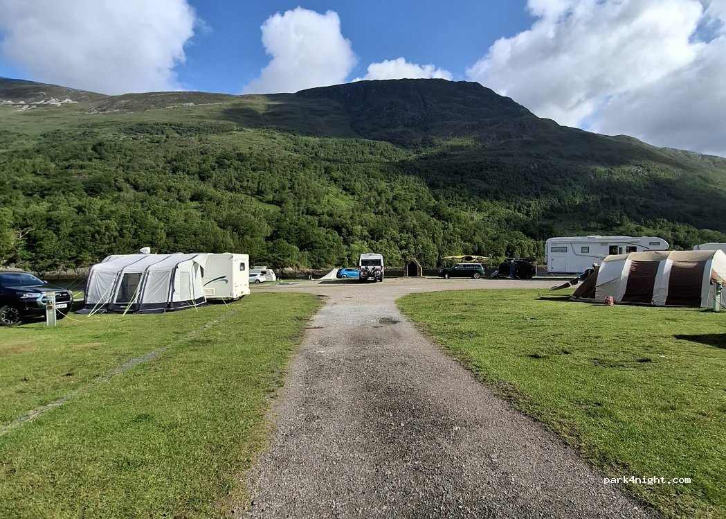 Très bel emplacement sur la rive avec une vue magnifique sur les montagnes du Loch Leven. Les cerfs sont debout sur le rocher à côté. Pas d'emplacements divisés, chacun se positionne comme bon lui semble et s'approvisionne en électricité selon ses besoins. Il peut y avoir beaucoup de monde et d'étroitesse, les branchements deviennent alors rares et les installations sanitaires, par ailleurs très bonnes, avec seulement quelques toilettes et douches, souffrent du point de vue hygiénique.