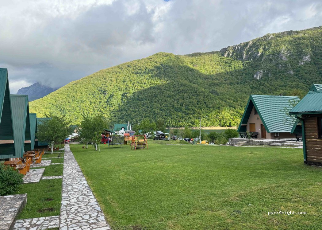 Endroit glauque, juste des bungalows, un espace de jeux, un remblais defoncé en arrière plan il reste un peu de place pour, au mieux, 2-3 campers devant la terrasse de ce qui pourrait être un restaurant (fermé en mai). Électricité OK, un seul douche WC avec porte verrouillable , rare dans ce pays. pas d'évier pour la vaisselle. Propriétaire accueillant.
