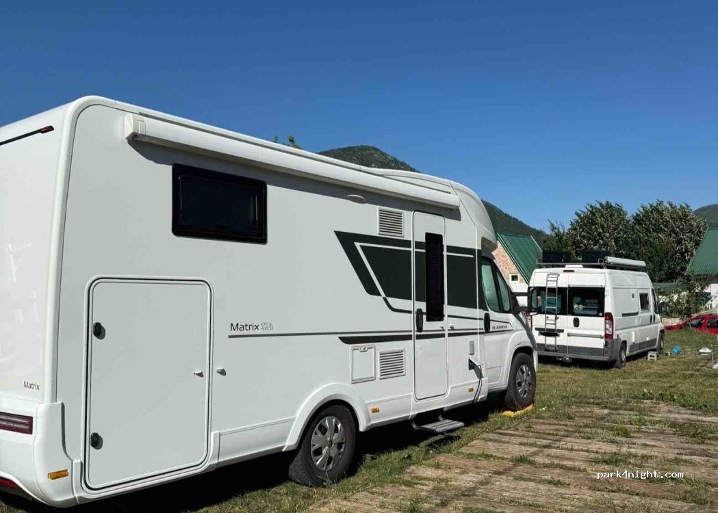 Een aantal vlakke plaatsen op een grasveld aan een speeltuin. Overdekt terras (zonder restaurant) ernaast. Goeie wifi, stroom ook beschikbaar. 1 douche en 1 toilet samen in een klein gebouwtje, het werd niet gekuist toen wij er waren dus niet zo proper. Geen andere faciliteiten. Goed voor een doorreis maar te duur voor wat het is. Wij betaalden 20€ voor 2p en camper van 8m.