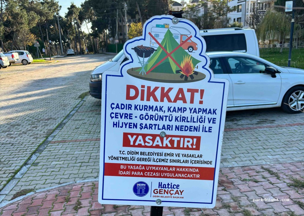 Très bien pour se balader dans Didim. Un panneau interdisant les tentes et le camping (voir photo). Je ne sais pas si c’est les véhicules qui sont interdits où l’installation camping comme font certains. Dans le doute, je ne suis pas restée la nuit, j’ai préférer reprendre la route pour ne pas risquer de me faire virer en pleine nuit ou dans la soirée.