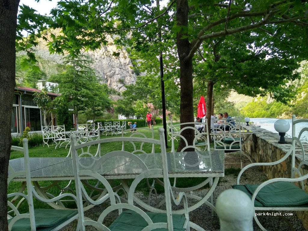 Parking du restaurant autorisé par le propriétaire et gratuit à condition de consommer ou payer 5€ par nuit. Accessible à tous les gabarits, le stationnement est stabilisé, globalement de niveau, dominant la rivière, sans ombre et en contrebas d'une route très fréquentée. L'endroit est une bonne alternative sur la route d'Elbassan. Restaurant satisfaisant aux tarifs albanais. Aucun service.