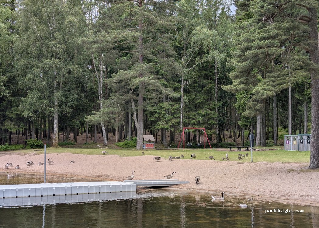 large parking, à dozen of camping car were also present, nice lake close to the parking, even if the beach was crowdy. quite noisy in rhe evening. surte train station is 5min from there, we parked on the park and ride and went easyly to goteborg for à day.