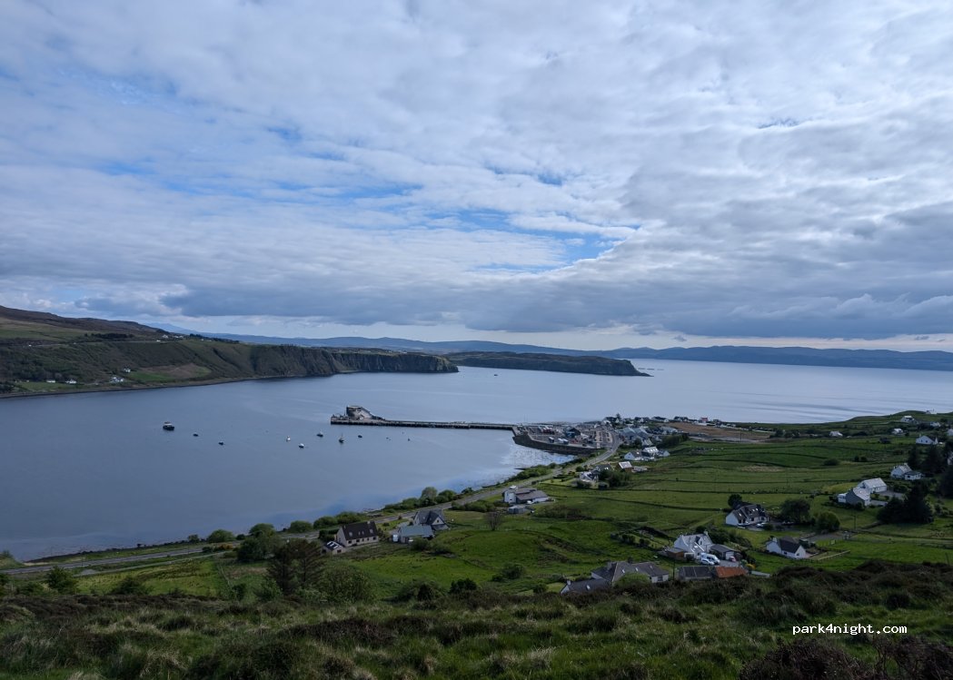 A really lovely spot overlooking Uig, with spectacular views and a great sunset too!Although the road was quite busy when we first parked up it became very quiet from about 9pm, and we had a peaceful night's sleep along with three other motorhomes.