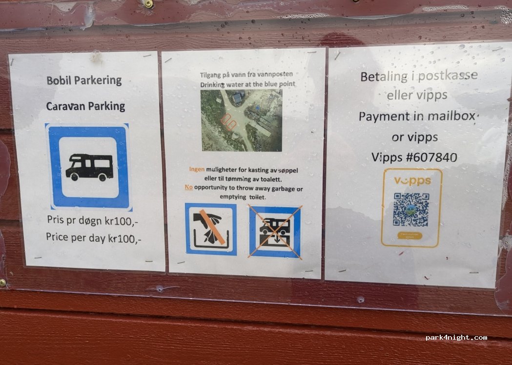 Sehr schöner Stellplatz für 2 Wohnmobile am kleinen Hafen. Kosten: 100 NOK in den Briefkasten am kleinen roten Schuppen. Nette Bootsbesitzer die sogar deutsch sprechen!! Trinkwasser kann aufgefüllt werden. Sehr Empfehlenswert!
