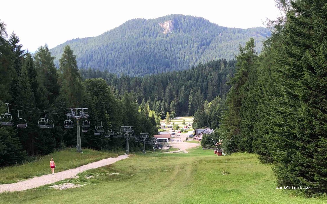 Parcheggio della funivia, molto spazio, in piano, senza nessun servizio ma anche senza nessun divieto. In mezzo al bosco, molto tranquillo per una notte in camper anche di grandi dimensioni