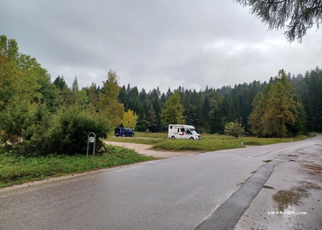 Ampio parcheggio nel verde, in fondo a una seggiovia. Trovato semi-vuoto anche in alta stagione. Di notte silenzioso e per nulla popolato. Abbiamo trovato altri camper ma tutti ben distanziati. Acqua solo in paese