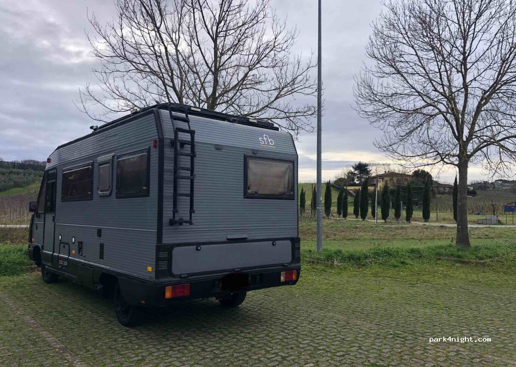 Parking in the Leonardo da Vinci village, near sports center, tends to get full quickly, we parked on the side for cars, spend the night in calm. Spot is otherwise unremarkable, but driving there offers you beautiful tuscan scenery sights, so worth the trip in any case.