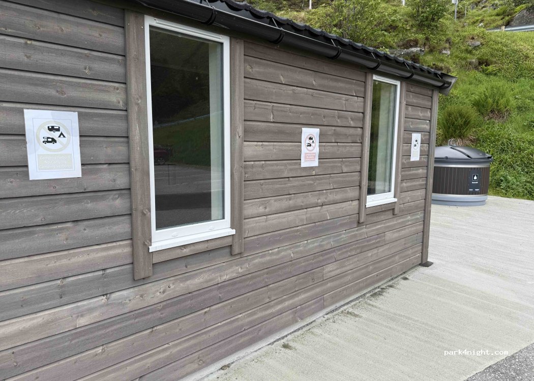 Wonderful place to stay with really well kept toilets with hot water in the sink. Felt like luxury compared to life on the road. There was however a «Camping forbidden» sign there.