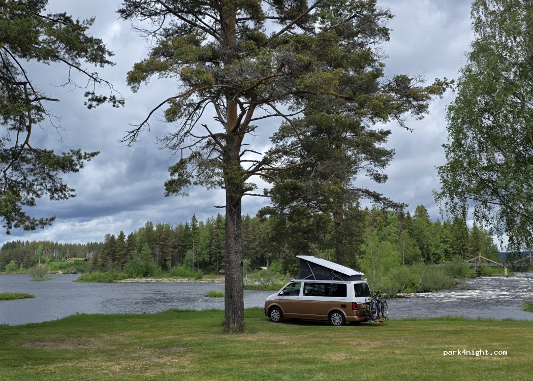 One of our best campsite of the week. Camper van pitch by a beautiful river. Nice walk to the forest museum island, with old traditional houses. Plenty of space. Quiet.