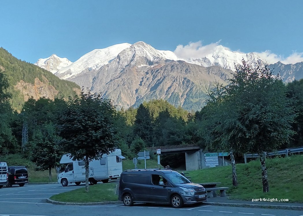 Aire de la fontaine (gratuit), simple mais sympa, propre et calme (interdit aux poids lourds). Super vu sur le Mont Blanc. Idéal pour une nuit avant de découvrir la vallée de Chamonix.