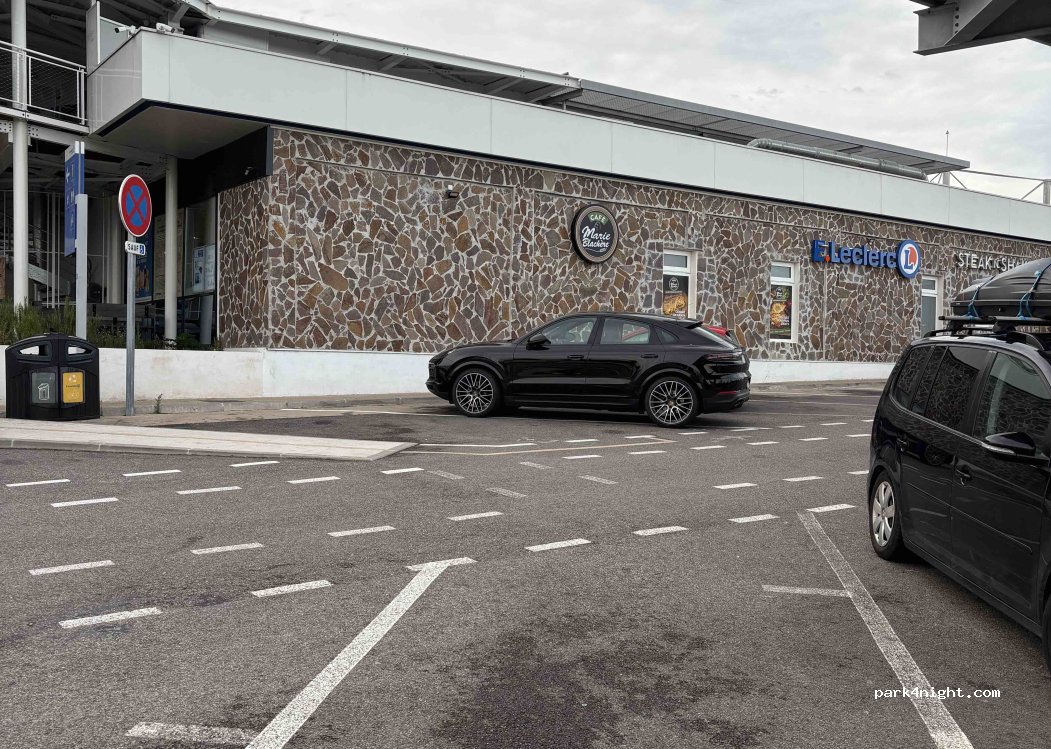 En la entrada de la gasolinera en la parte izquierda hay varios aparcamientos, pasamos la noche aquí con dos caravanas y otra camper. hay un mini supermercado Leclerc y hay servicio de DUCHA GRATUITO 24H. El personal de la gasolinera es amable y hay seguridad. está pegado a la autovía y se escuchan los ruidos pero tranquilo. lo mejor la ducha.