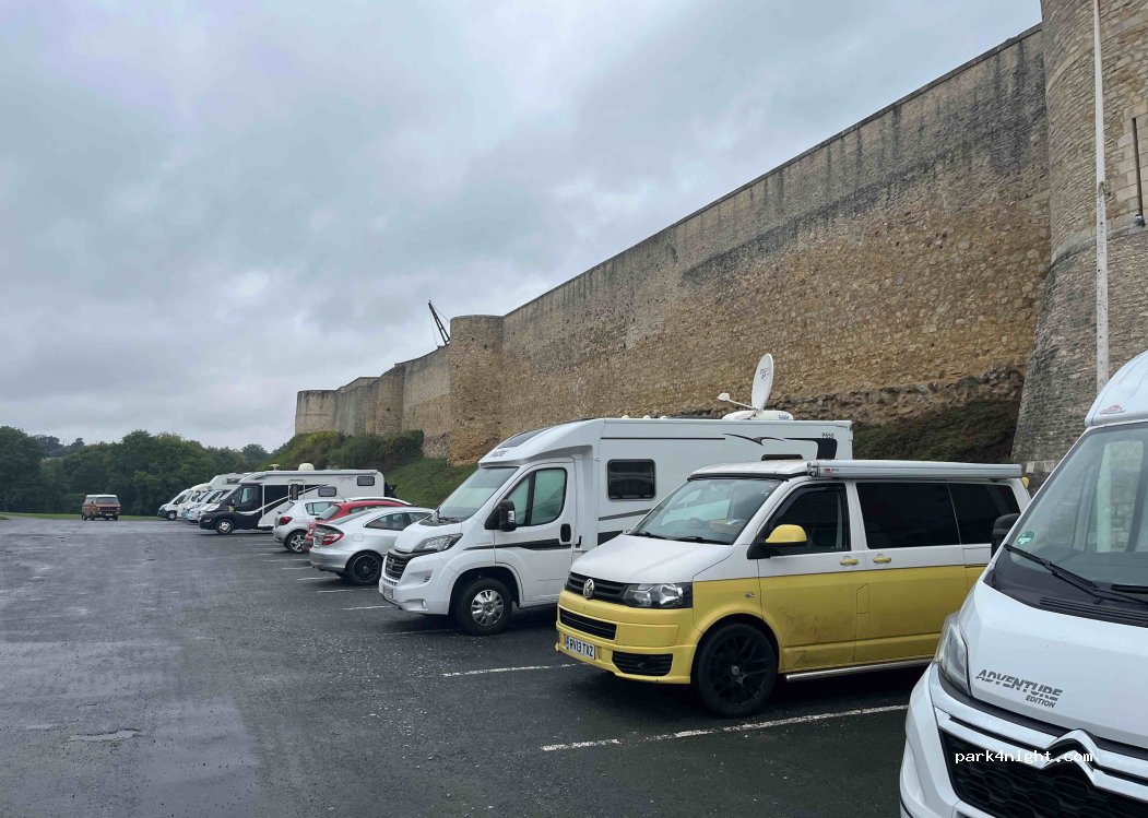 Large car park at the base of Castle walls. No facilities other than bins, but very close to town centre and a few minutes walk to Tourist Information, Entrance to Castle and Entrance to Civilian War Museum. Self operated laundry just round the corner from tourist information on Rue Trinite. Very peaceful night.