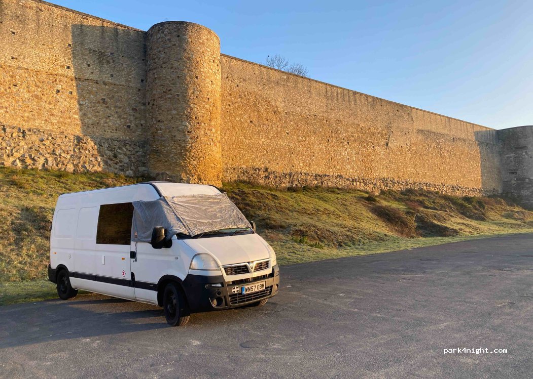 Parking juste tranquille pour la nuit, au pied des remparts du château de Guillaume le Conquérant.
