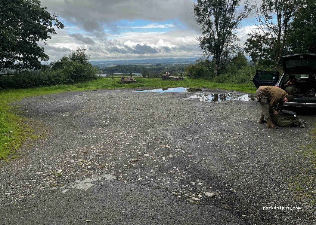 Small flat gravel car park with beautiful views down to Talkin Tarn lake. Very peaceful and quiet. No road noise overnight . A few locals came to admire the view otherwise alone. A few waterlogged potholes when we stayed that affected where to park . Nice circular walks down to lake and Brampton. And no bins otherwise perfect spot .