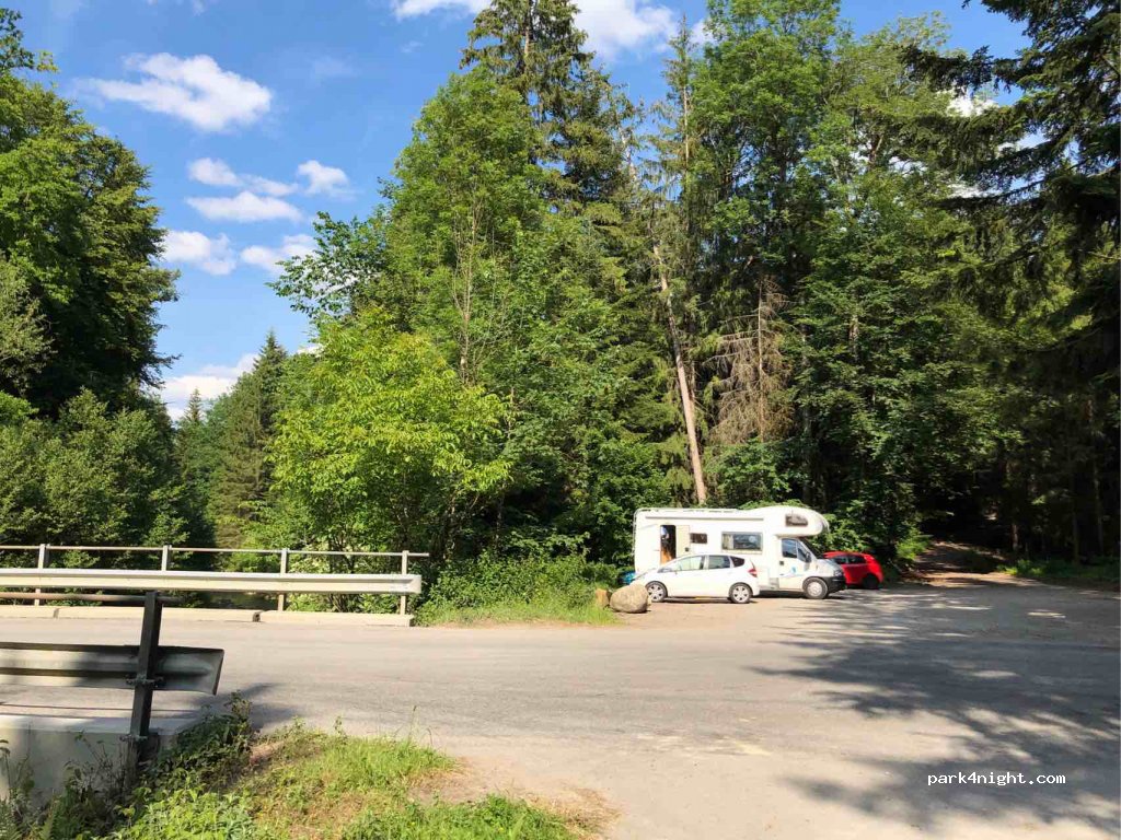 Im Moment von Forstarbeitern benutzt. Denen sollte man das Wohnmobil wohl nicht in den Weg stellen. So wie auf dem Bild sieht es momentan nicht aus. Gleich dahinter, an der einen Seite der Waldstrasse, hat es zwar Platz zum Parkieren (wohl für Spaziergänger oder wieder Forstarbeiter), aber es steht dort ein ausdrückliches Parkverbot für beidseits der Strasse auf der ganzen Länge des Waldes...